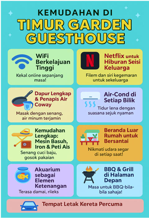 TIMUR - Garden Guest House menawarkan penginapan yang selesa, lengkap dengan pelbagai kemudahan moden – sesuai untuk percutian keluarga dan lawatan santai ke Pantai Timur.Guesthouse ini merupakan rumah extended teres corner lot dilengkapi dengan 3 bilik berhawa dingin (4 unit katil queen) dan 2 bilik air, direka untuk keselesaan maksimum para tetamu.Halaman depan dan tepi rumah yang luas memberikan pengalaman yang menarik terutama bagi tetamu yang ingin mengadakan aktiviti outdoor seperti grill & BBQ (Tapak BBQ tersedia).